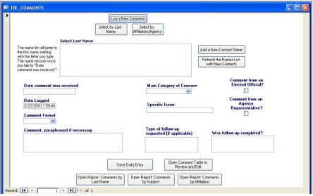 Comments and remarks are entered in a "many-to-one" format, which means that each remark or comment provided by an individual receives its own unique identifier, but are all linked back to the provider's contact information (see Figure 3). When used from the beginning of a study, this function is particularly useful in identifying trends in the issues of concern raised by public and agency respondents.